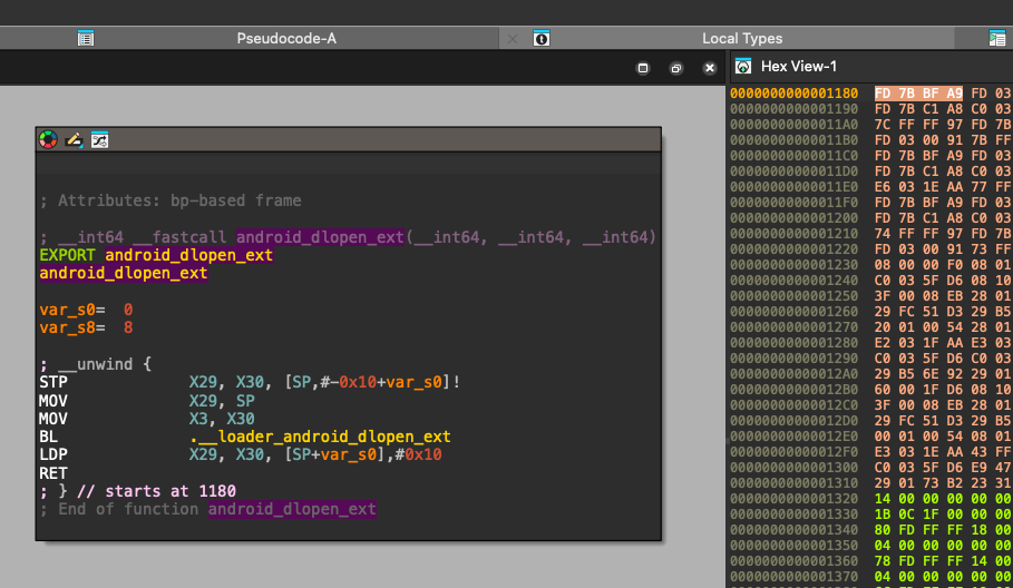 android_dlopen_ext 를 주목하면 된다. 라이브러리 libdl.so 안에 0x1180 오프셋에 있다.